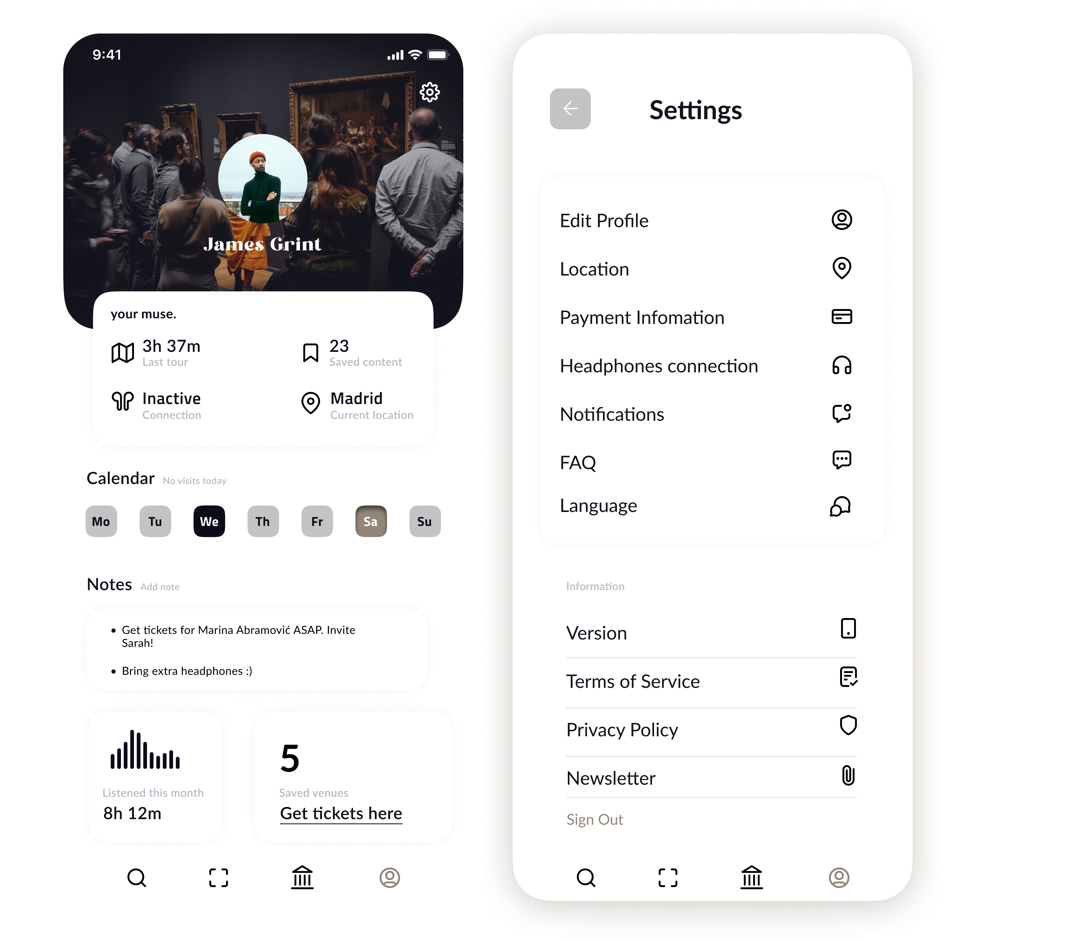 Profiles feature the app use, future visits, notes and shortcut to get tickets. Settings allows the user to modify some options.